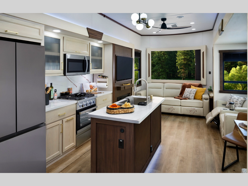 Sleeps 5 Slides 2 Length 42 ft 10 in Ext Width 8 ft 5 in Ext Height 13 ft 5 in Hitch Weight 1238 lbs GVWR 13238 lbs Dry Weight 11977 lbs Cargo Capacity 1261 lbs Fresh Water Capacity 75 gals Grey Water Capacity 82 gals Black Water Capacity 41 gals Available Beds King Refrigerator Type 12V Glass Front with Icemaker Refrigerator Size 18 cu ft Cooktop Burners 3 Shower Size 48" x 30" Number of Awnings 2 Water Heater Capacity 20 gal Water Heater Type Electric AC BTU 30000 btu TV Info LR 50" Smart TV, BR 32" TV Awning Info 11' 6" and 18' Electric w/LED Night Lighting Axle Count 2 Washer/Dryer Available Yes Shower Type Shower w/Seat Similar Floorplans