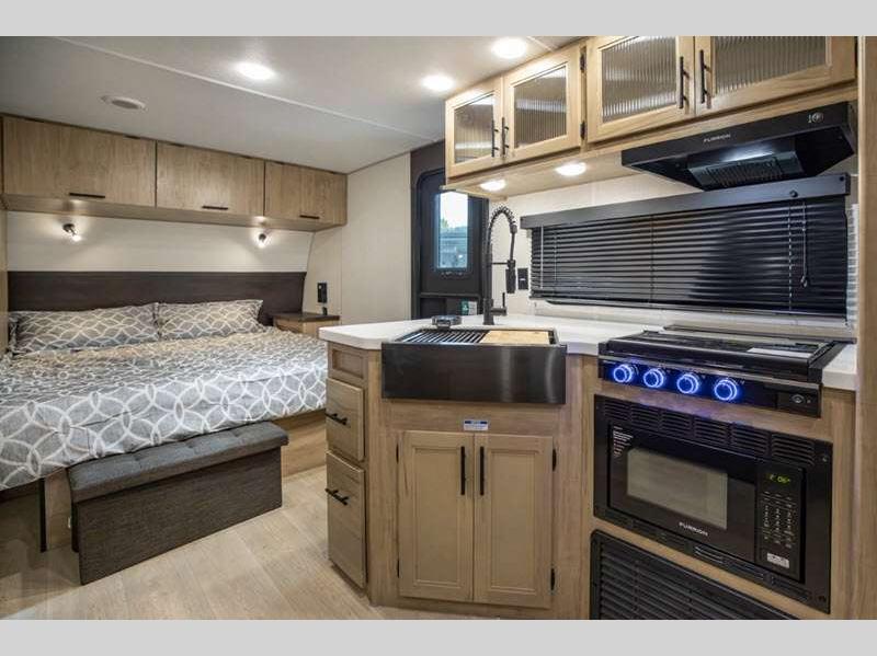 Sleeps 6 Slides 1 Length 34 ft 2 in Ext Width 8 ft Ext Height 10 ft 8 in Int Height 0 ft Hitch Weight 1244 lbs GVWR 9995 lbs Dry Weight 7355 lbs Cargo Capacity 2640 lbs Fresh Water Capacity 52 gals Grey Water Capacity 38 gals Black Water Capacity 38 gals Furnace BTU 20000 btu Available Beds RV King Refrigerator Type 12V Cooktop Burners 3 Number of Awnings 1 Garage Size 11 ft Water Heater Type Tankless AC BTU 15000 btu Awning Info 15' Full Length Power w/LED Light Strip Axle Count 2 Shower Type Standard Solar Wattage 200 watts Similar Floorplans
