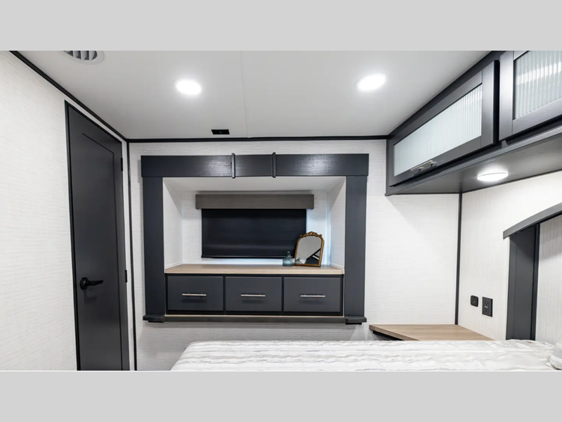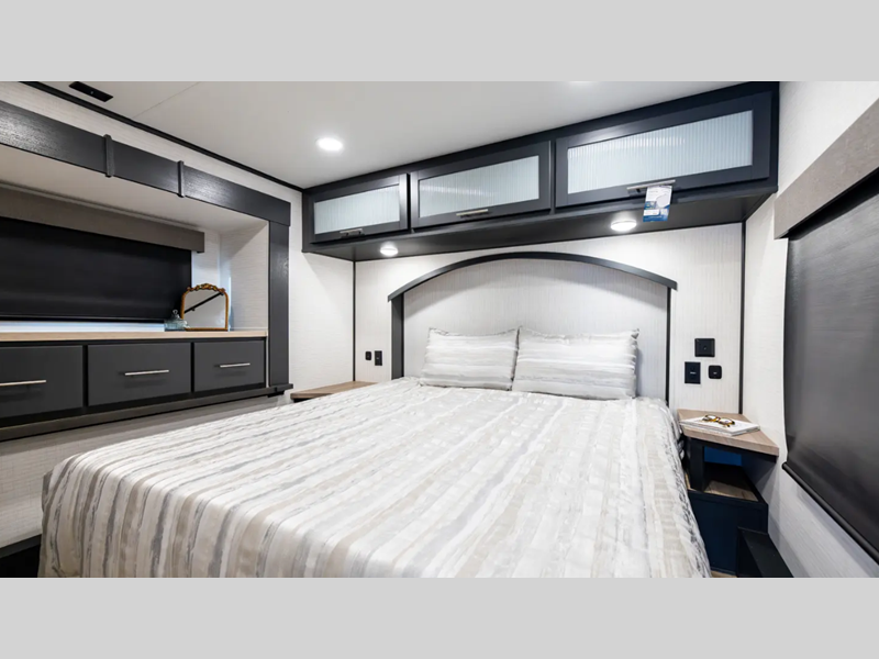 Sleeps 6 Slides 2 Length 32 ft 3 in Ext Width 8 ft 6 in Ext Height 13 ft 5 in Int Height 0 ft Hitch Weight 2265 lbs GVWR 15719 lbs Dry Weight 10419 lbs Cargo Capacity 5300 lbs Fresh Water Capacity 150 gals Grey Water Capacity 97 gals Black Water Capacity 40 gals Tire Size 16 Furnace BTU 35000 btu Number Of Bunks 1 Available Beds King Refrigerator Type 12V Refrigerator Size 15.7 cu ft Convection Cooking Yes Number of Awnings 1 Axle Weight 7000 lbs Garage Size 15 ft 7 in LP Tank Capacity 20 Water Heater Type Tankless AC BTU 30000 btu Awning Info With LED Lights Axle Count 2 Number of LP Tanks 2 Shower Type Radius Solar Wattage 200 watts Similar Floorplans