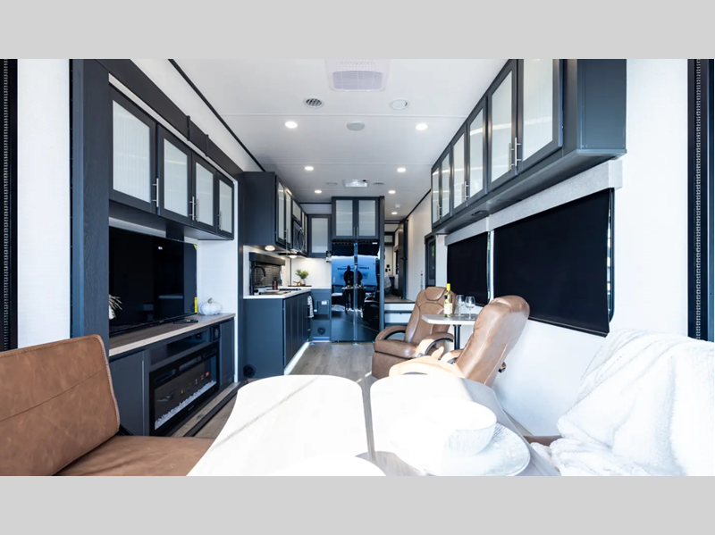 Sleeps 6 Slides 2 Length 36 ft 10 in Ext Width 8 ft 6 in Ext Height 13 ft 6 in Hitch Weight 2555 lbs GVWR 16555 lbs Dry Weight 10879 lbs Cargo Capacity 5676 lbs Fresh Water Capacity 150 gals Grey Water Capacity 132 gals Black Water Capacity 40 gals Tire Size 16 Furnace BTU 35000 btu Number Of Bunks 1 Available Beds King Refrigerator Type 12V Refrigerator Size 15.7 cu ft Convection Cooking Yes Number of Awnings 1 Axle Weight 7000 lbs Garage Size 19 ft 7 in LP Tank Capacity 20 Water Heater Type Tankless AC BTU 30000 btu Awning Info With LED Lights Axle Count 2 Number of LP Tanks 2 Shower Type Standard Solar Wattage 200 watts Similar Floorplans
