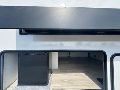 This fifth wheel is packed with convenient features to make your travels more comfortable and enjoyable! The master bedroom includes a king bed slide out with USB ports on either side of the bed so you both can charge your phones, and there is a dresser for your folded clothes. You will love the front bathroom with dual bath sinks, a fiberglass one-piece shower, plus a walk-in closet with shelves and rods to hang clothes! There is a unique middle utility room with washer and dryer prep if you want to add these, a Washer and dryer counter and a rod to hang clothes that will make a perfect laundry room, or you can utilize this space for storage! Head to the main living area to relax on the theater seating or hide-a-bed sofa, and if you have guests stay over, they can sleep here. There is also an entertainment center with a 50" flat screen TV, but you might just leave that off if you're working at the desk with a chair that is provided. We've saved the best part for last, the kitchen! Here, you'll find ample counter space to prep home-cooked meals, a three-burner range with a 24" oven, plus a large counter with barstools where you can enjoy breakfast at each morning. Choosing this fifth wheel is a no-brainer!