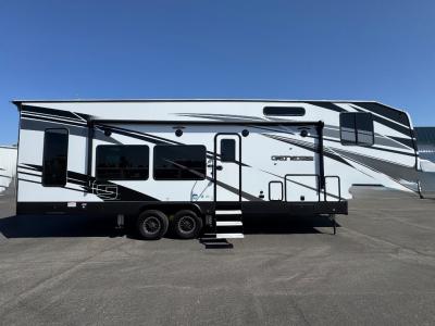 Sleeps 6 Slides 2 Length 36 ft 10 in Ext Width 8 ft 6 in Hitch Weight 2700 lbs GVWR 15000 lbs Dry Weight 11560 lbs Cargo Capacity 3440 lbs Fresh Water Capacity 160 gals Grey Water Capacity 50 gals Black Water Capacity 50 gals Tire Size 16" Furnace BTU 35000 btu Generator 4.0KW Onan Fuel Capacity 40 gals Number Of Bunks 1 Available Beds RV King Refrigerator Type Extra Large Double Door Refrigerator Size 8 cu ft Cooktop Burners 3 Number of Awnings 1 Axle Weight 8860 lbs Garage Size 16 ft 4 in LP Tank Capacity 30 lbs Water Heater Capacity 10 gal Water Heater Type 110V/LP DSI AC BTU 15000 btu TV Info LR 50" TV, BR 32" TV Awning Info Power with LED Light Strip Axle Count 2 Number of LP Tanks 2 Shower Type Radius Similar Toy Hauler Fifth Wheel Floorplans